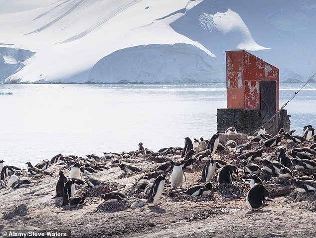 Parece que não lhe faltará companhia neste lugar. Pinguins montam guarda do lado de fora de uma casinha fria, na Ilha D’Hainaut, Arquipélago Palmer, Antártica