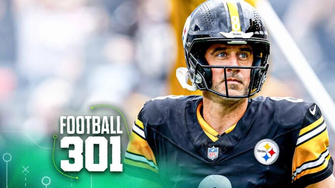 PITTSBURGH, PENSILVÂNIA – 12 DE OUTUBRO: Aaron Rodgers # 8 do Pittsburgh Steelers corre em campo antes do jogo da NFL 2025 contra o Cleveland Browns no Acrizar Stadium em 12 de outubro de 2025 em Pittsburgh, Pensilvânia. (Foto de Laurent Le Bacho/Getty Images)