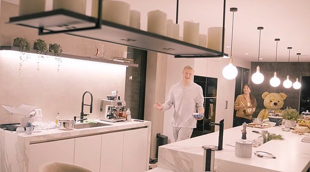E o mais atraente é uma cozinha luxuosa e arejada com uma enorme ilha onde Haaland prepara e come alimentos que o ajudam a engolir seus oponentes.