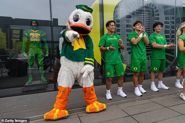 No sábado, universidade Orégan Hospedagem Oklahola Universidade Estadual Quando seu mascote – poças (também conhecido como Oregon Duck) – saiu com um vestido diferente do normal.