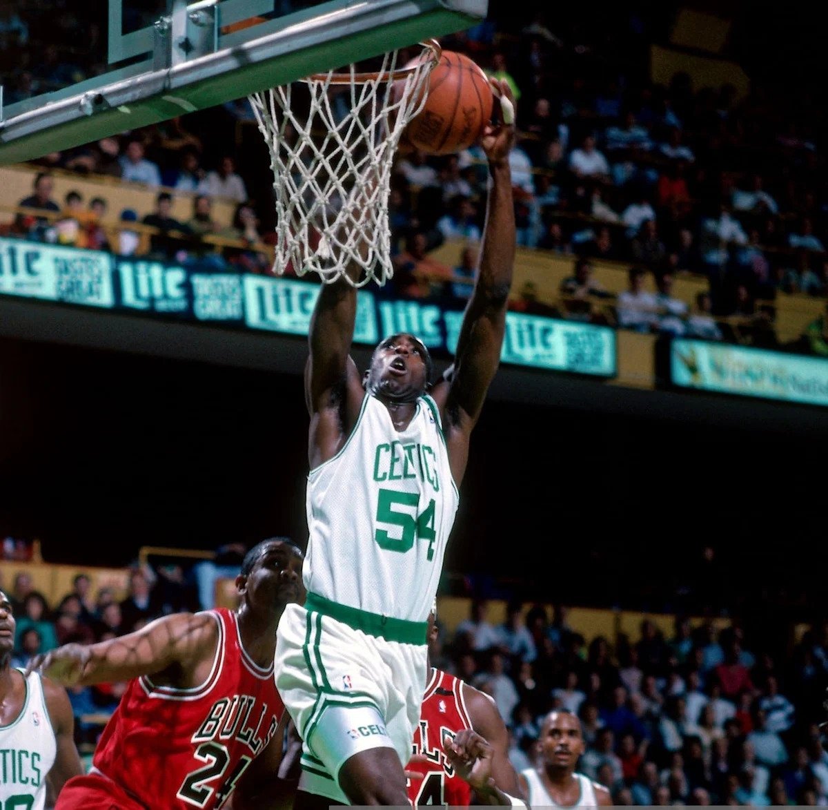 Boston, MA – 1992: Ed Pinkney #54 do Boston Celtics enterra contra o Chicago Bulls durante um jogo disputado no Boston Garden em Boston, Massachusetts, em 1992. Nota ao usuário: O usuário reconhece e concorda expressamente que, ao baixar e/ou usar esta fotografia, o usuário concorda com os termos e condições do Contrato de licença da Getty Images. Aviso importante de direitos autorais: Copyright 1992 NBAE (Foto de Dick Raphael/NBAE via Getty Images)