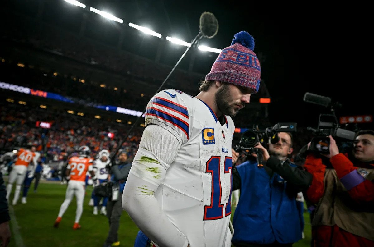 Josh Allen saiu de campo depois que a temporada dos Bills terminou com uma derrota nos playoffs para o Broncos. (Foto de Aaron Ontiveros/The Denver Post)