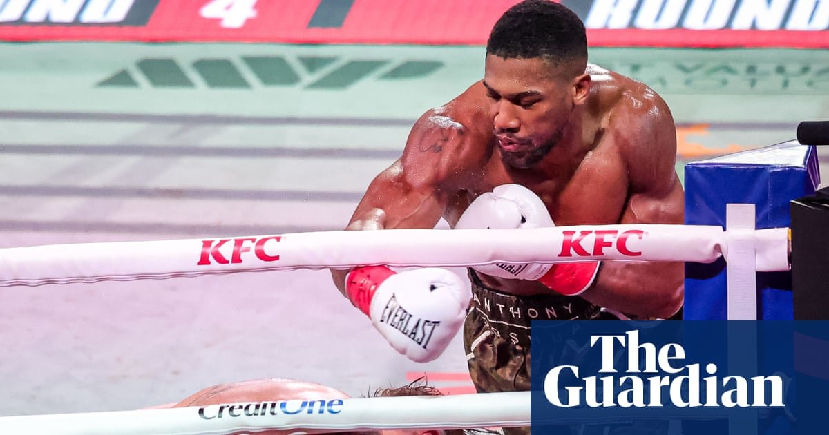 Anthony Joshua comemorou, mas seu desempenho não impressionou. Fotografia: Leonardo Fernández/Getty Images