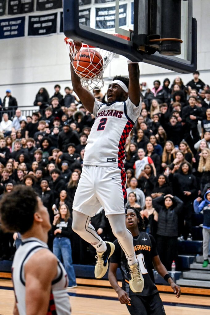 KJ Torbert, de East Lansing, enterra contra a Waverly faltando segundos para o final do quarto período na East Lansing High School na quinta-feira, 18 de dezembro de 2025.
