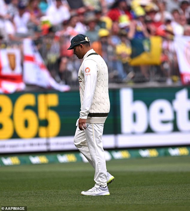 Usman Khawaja pode ser visto saindo do campo desapontado no segundo dia do primeiro Teste Ashes em Perth.