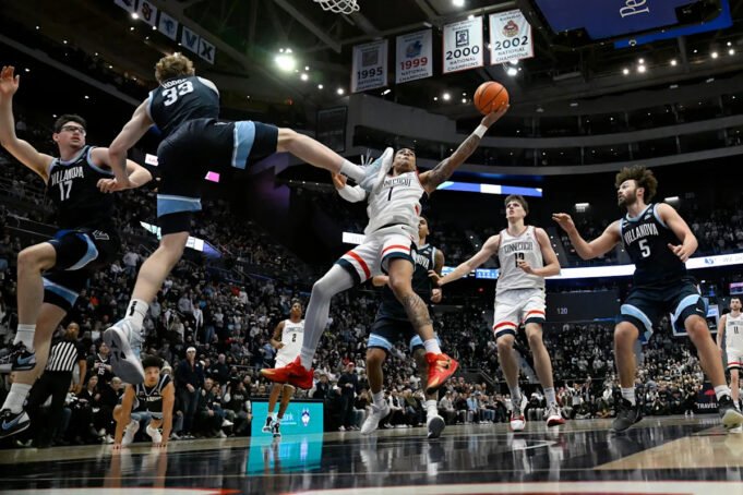 Eles realizaram outro thriller contra um time problemático dos Wildcats que forçou um frame extra. UConn (19-1, 9-0 Big East) marcou os últimos oito pontos na prorrogação para derrotar Villanova (15-5, 6-3) por 75-67.