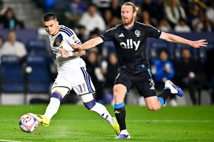 Tim Ream (R) e Charlotte FC tiveram dificuldades na derrota de sábado por 3 a 0 para o LA Galaxy, no Dignity Health Sports Park.