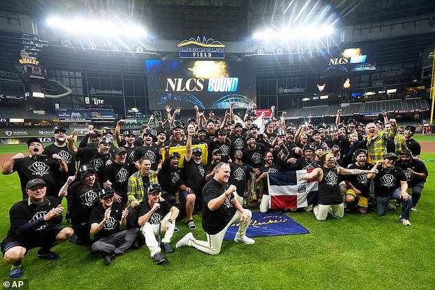 Os Brewers foram vistos reunidos atrás da bandeira ‘Bob Uecker’ após a vitória nos playoffs de sábado
