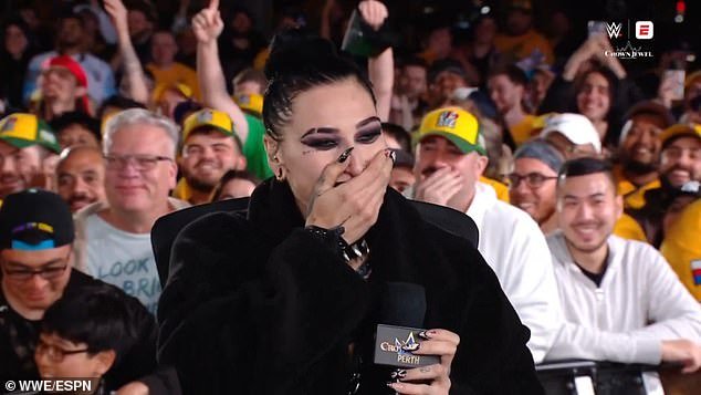 Na foto: o momento em que a estrela australiana da WWE Rhea Ripley reage ao canto obsceno da multidão sobre sua rival, a lutadora japonesa Asuka