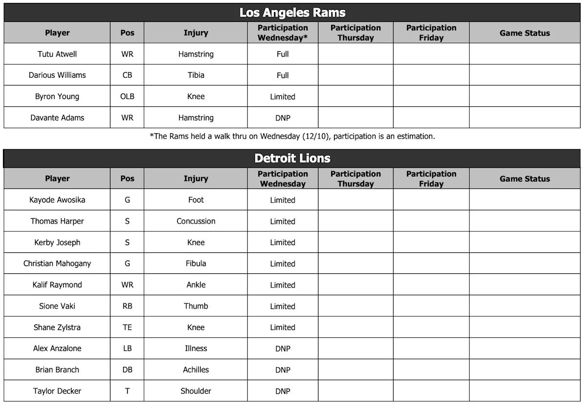 Antes dos jogos deste fim de semana, cada equipe entrou em campo para o primeiro treino da semana na quarta-feira. Os Rams realizaram walkthroughs, então a participação é uma suposição, mas eles terão dois treinos regulares na quinta e sexta-feira.