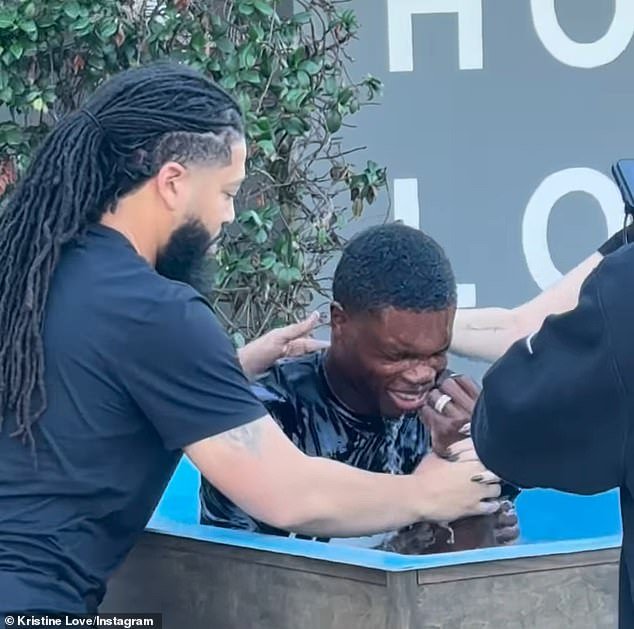 ‘Não consegui encontrar minhas chaves esta manhã e estava atrasado para a igreja, então fui ao batismo de Travis Hunter, do Jacksonville Jaguars!’ Christine Love escreveu no Instagram. ‘Ele pediu para vir e ser batizado antes do jogo de hoje. Obrigado, Jesus, por tocar a vida deste jovem!’