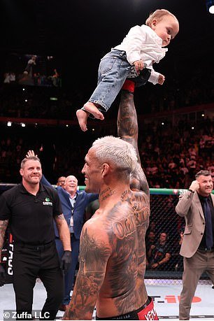 Como parte das comemorações, Oliveira ergueu orgulhosamente seu filho, Dominic, no ar com apenas uma mão e girou-o no octógono.