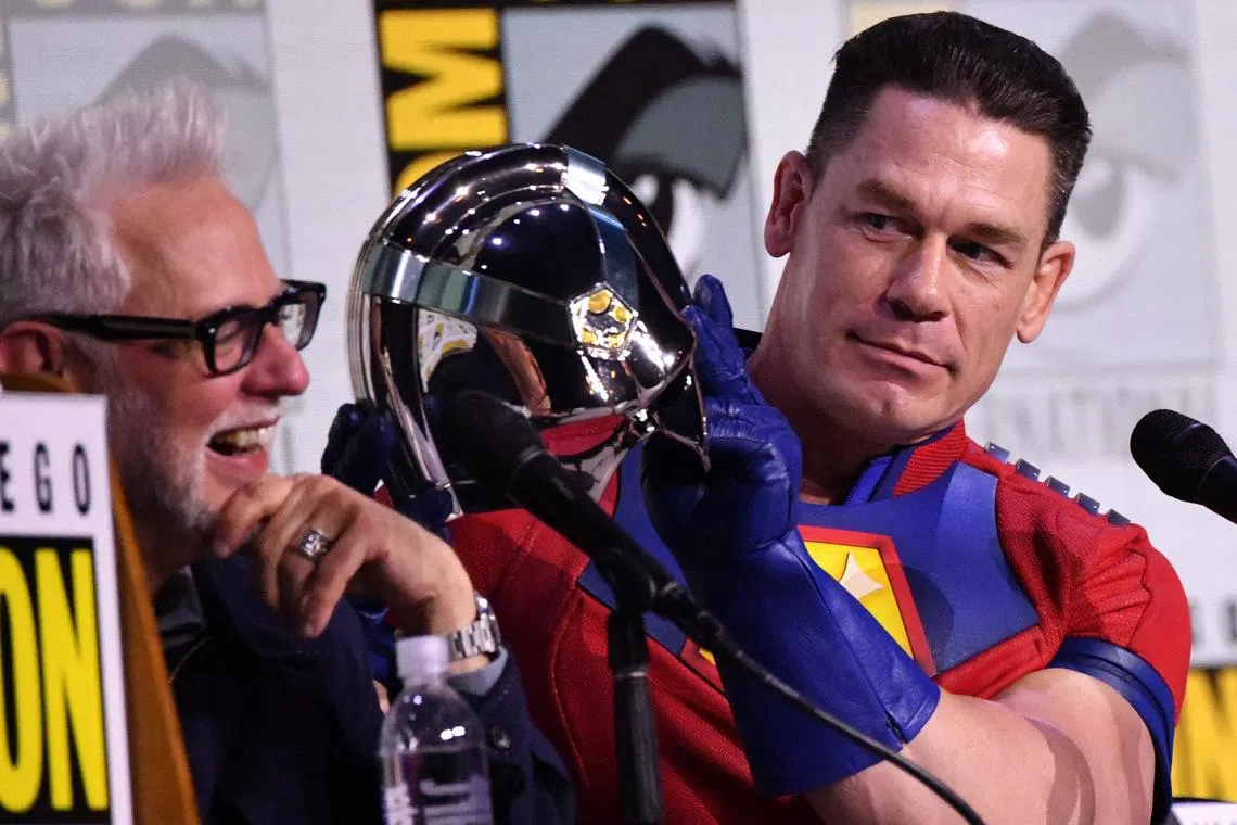 O ator dos EUA John Cena (à direita) segura seu capacete ao lado do diretor dos EUA, James Gunn, durante o painel de pacificador 2 na Comic-Con International em San Diego, Califórnia, em 26 de julho.