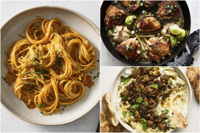 Esse rápido O jantar de frigideira com carne moída temperada e grelhada sobre resfriamento O iogurte combina elementos de dois clássicos persas: kebab koobideh (kebabs grelhados) e mastro-o-khiar (iogurte de pepino). O cremoso A base de iogurte se mantém perto do original, enquanto a carne moída é vendida de um lado Como uma vieira Para uma textura nítida. Nozes e passastradicionalmente coberturas para mastro-o-khiar, Seja torrado na gordura da carne, adicionando crocância e doçura para equilibrar a carne saborosa e o iogurte picante.