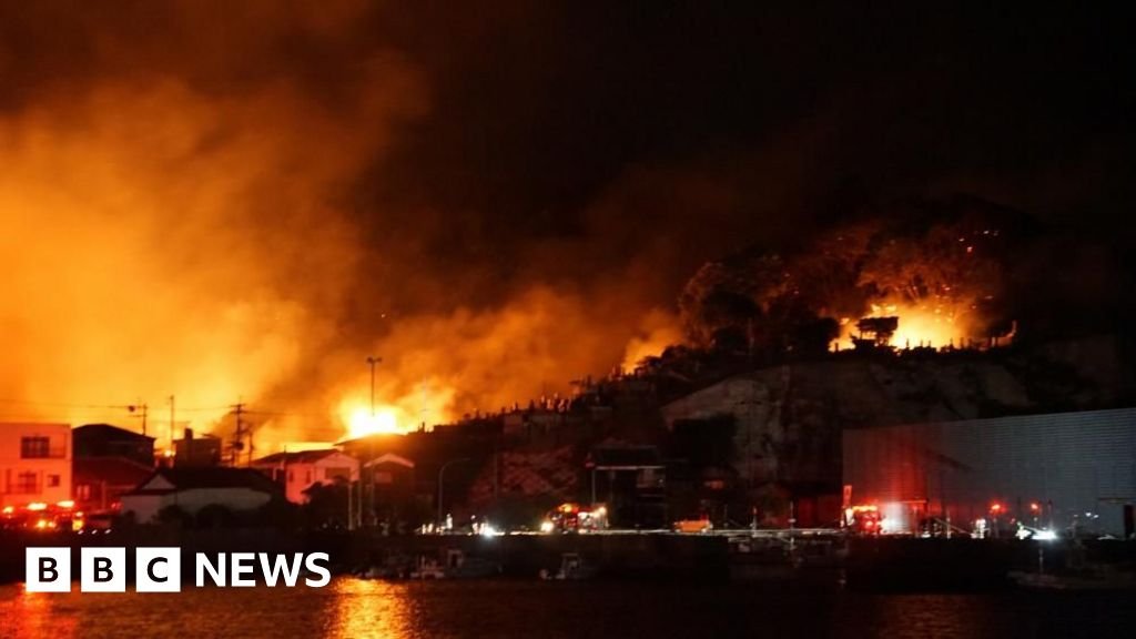 Imagens aéreas mostraram a escala do incêndio, supostamente do tamanho de sete campos de futebol, que atingiu vários edifícios residenciais perto do porto de pesca.