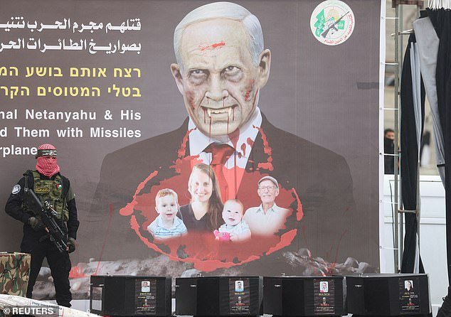 Um terrorista do Hamas perto de caixões durante a entrega de reféns mortos em fevereiro deste ano