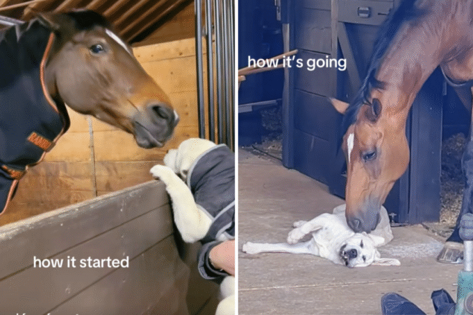 Usuários de mídia social elogiaram sua improbabilidade cães e cavalos O vídeo viral e de amizade do TikTok já recebeu mais de 590 comentários até o momento.
