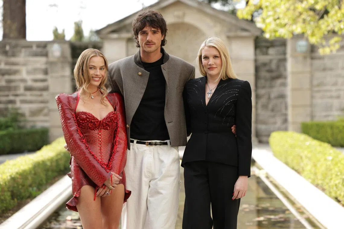 (A partir da esquerda) A atriz Margot Robbie, o ator Jacob Elordi e o diretor Emerald Fennell participam do photocall de “O Morro dos Ventos Uivantes”, realizado na Califórnia em 28 de janeiro.
