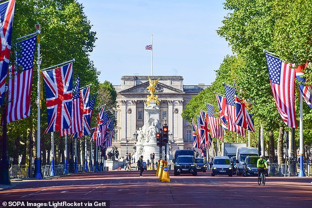 As bandeiras americanas e as bandeiras da Union Jack decoram o shopping que leva ao Palácio de Buckingham antes da visita de Donald Trump ao Palácio de Buckingham no mês passado.