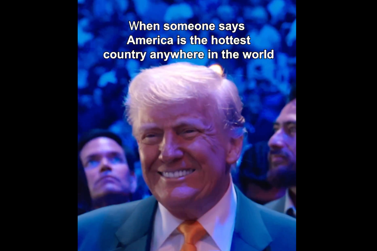 O vídeo começou com o que parecia ser uma imagem gerada por IA do presidente Donald Trump, sorrindo em uma sala lotada e iluminada com luzes azuis. Acima disso, uma legenda dizia: “Quando alguém diz que a América é o país mais quente do mundo”.