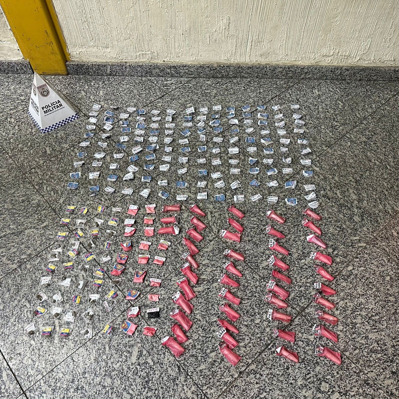 De dentro da sacola foram apreendidas 251 drogas, sendo 141 crack (70,5 gramas), 44 maconha (127,6 gramas), 21 cocaína (40,1 gramas) em filme plástico e 45 alfinetes contendo 9 gramas (9 gramas) da mesma substância.
