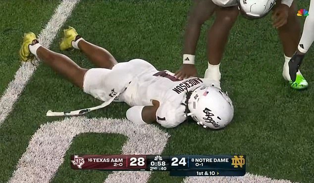 O zagueiro Tamu Bryas Anderson ficou desmaiado enquanto jogava no final do segundo trimestre, pois a peça parou em um jogo de futebol universitário de alto nível entre Notre Dame e Texas A&M.