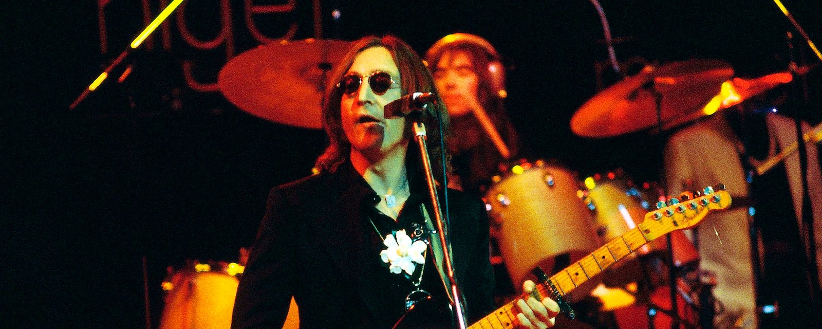 Foto: John Lennon se apresentando ao vivo no palco com Elton John, tocando uma guitarra Fender Telecaster (Steve Morley/Redferns)