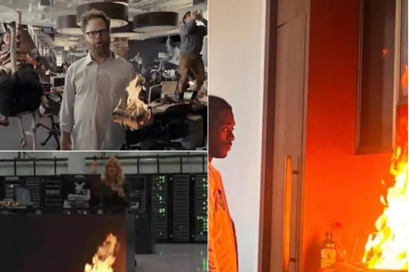 Em outra foto, uma funcionária joga alegremente um fósforo no chão encharcado de gasolina, incendiando uma enorme sala de servidores.