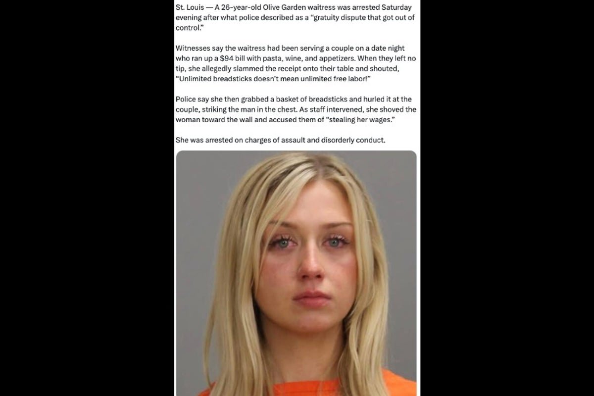 Uma história dramática de 26 anos Jardim de oliveiras Louis Waitress, Missouri, que presumiu que eles jogaram uma cesta de casal para um casal quando o pressionaram em uma prensa e disseram: “Pão ilimitado significa trabalho gratuito e ilimitado!” Começou recentemente nas redes sociais.
