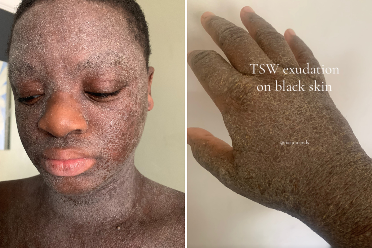 “Uma das coisas mais preocupantes é que o TSW se espalha para áreas onde nunca tive problemas de pele antes ou onde não apliquei creme esteróide”, diz Patrick. “Também experimentei descamação constante da pele do rosto, uma experiência muito dolorosa.
