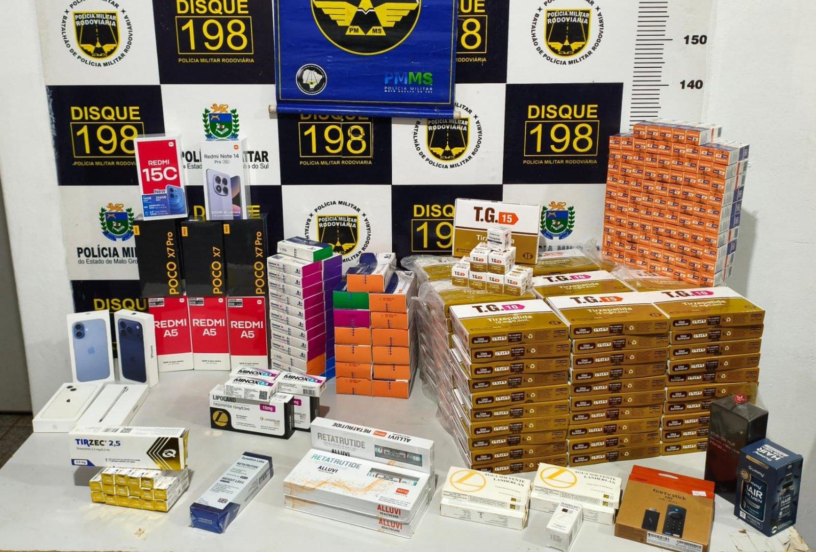 BPMRv apreendeu mais de 250 caixas de medicamentos ilegais para emagrecer em Ponta Porã (MS) Durante a Operação Ação Consciência Negra da Polícia Rodoviária Militar, policiais do Batalhão de Polícia Militar Rodoviária (BPMRv) apreenderam grande carga de drogas estrangeiras, incluindo diversas drogas para emagrecer, em uma PMS ou em 6 veículos parados pela PMS. (MS), na fronteira entre Brasil e Paraguai. A equipe da base operacional de Aquidabã se dirigiu a um GM Prisma e durante a verificação dos itens obrigatórios, foram encontradas no interior do veículo diversas caixas de medicamentos sem qualquer documento legal, além de celulares novos. ✅ Clique aqui para acompanhar o canal do g1 MS no WhatsApp Segundo a polícia, entre os produtos apreendidos estavam 256 caixas de tirzepetida, substância usada no emagrecimento e tratamento de diabetes; 133 caixas de Lipoles; 17 de Tirzek; 2 da Lipolândia; 1 dos Laboratórios Synedica; 103 caixas de TG; Além de quatro unidades de retatrutida, medicamento considerado altamente eficaz para perda de peso. Também foram arrecadadas duas caixas de Landatropin, uma unidade de Oxandroland 5, três frascos de Minoxidil, uma cola para cabelo e uma loção corporal. Médico alerta sobre perigos do contrabando de canetas para emagrecer Além das drogas, a polícia contabilizou 12 celulares novos, entre iPhones, Redmis e Poco, e um aparelho Fire Stick. O motorista disse aos militares que foi contratado por um conhecido para buscar a mercadoria no Paraguai e que receberia R$ 1,2 mil pelo transporte. Ao se deparar com irregularidades, a equipe acionou a Polícia Federal em Ponta Porã. Conforme orientação dos agentes federais, o veículo e toda a carga serão entregues à Receita Federal em data agendada. O motorista foi liberado após assinar um acordo de custódia. O prejuízo estimado com o crime é de R$ 149 mil. Assista vídeos de Mato Grosso do Sul: