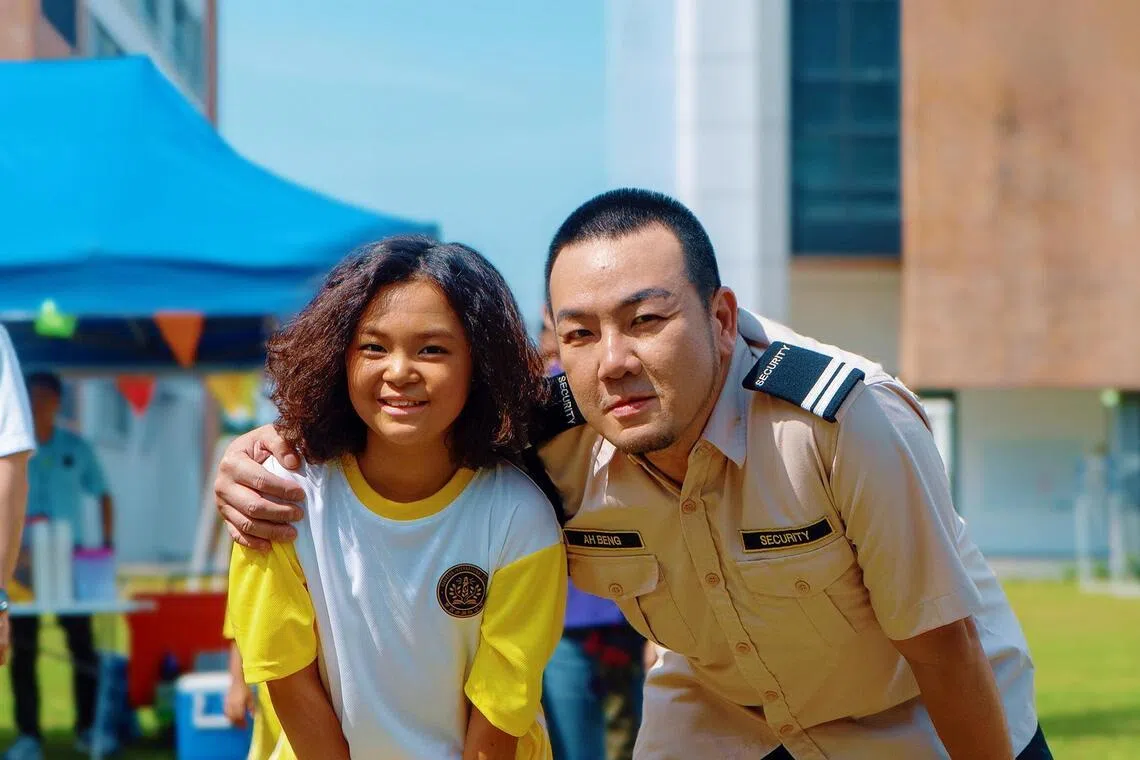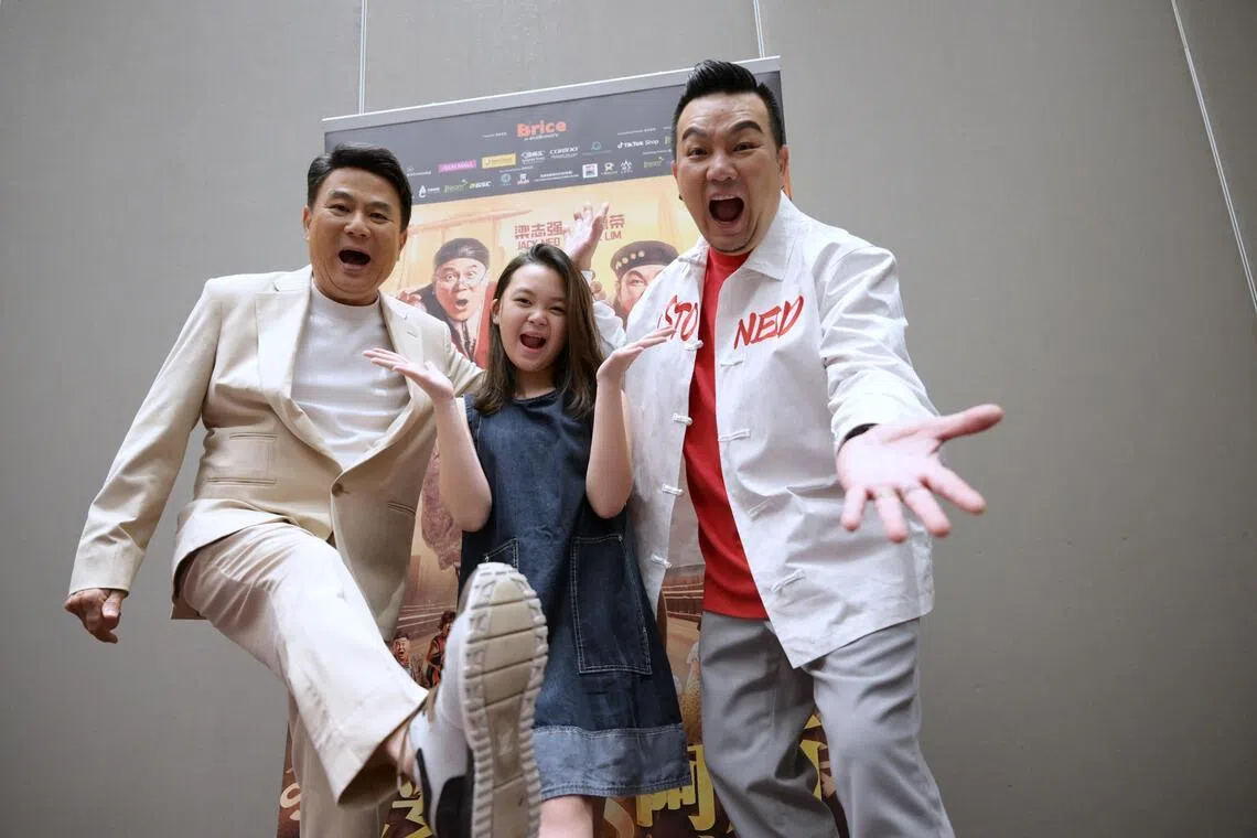 As atrizes infantis Ivory Cheah e Jack Neo (à esquerda) e o comediante malaio Jack Lim, que interpreta o pai em “Liang Por Por vs. Ah Beng”.