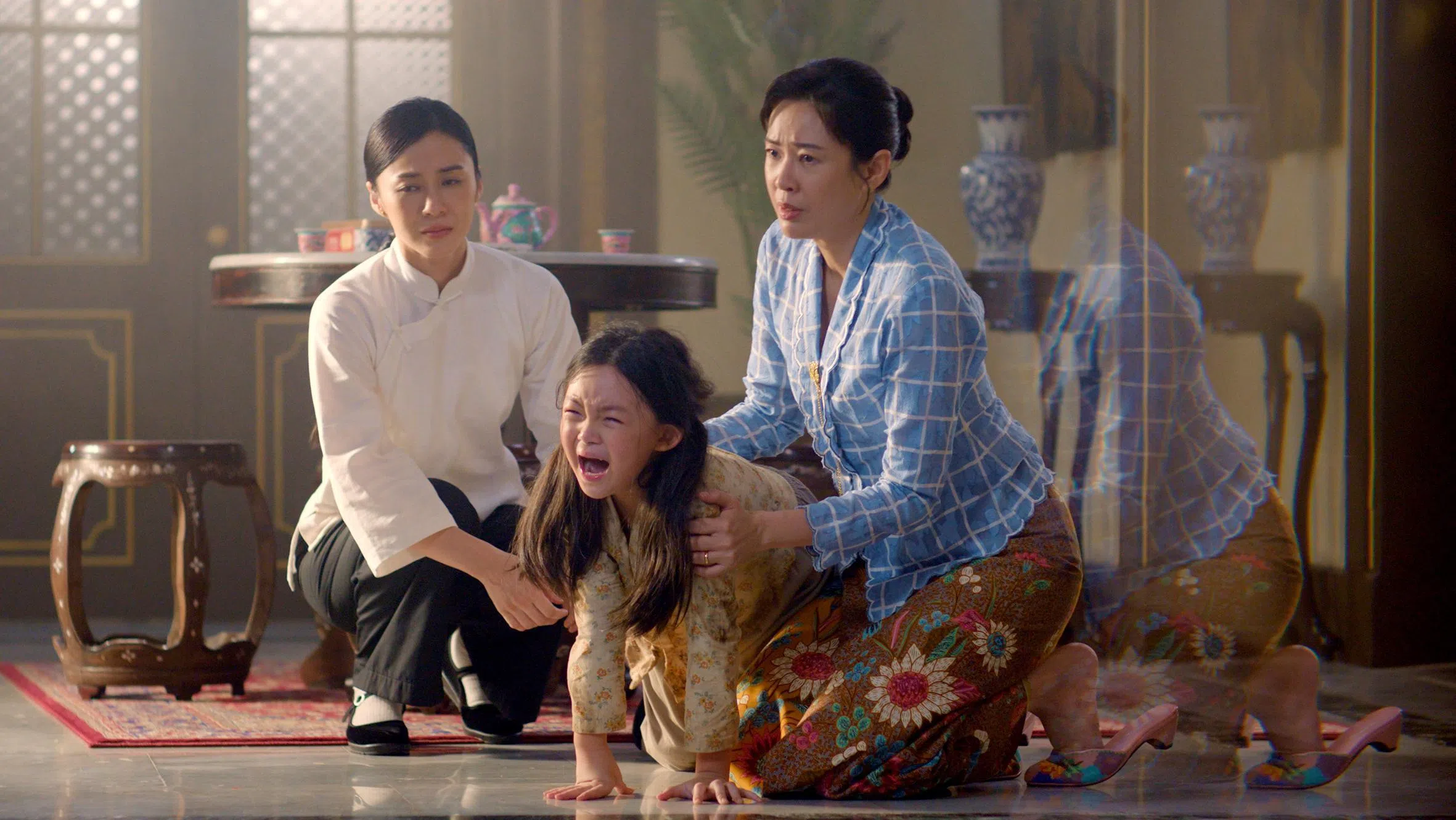 Ivory Chia (centro) e Jesseka Liu (à direita) em “Emerald Hill: A Little Nyonya Story”.