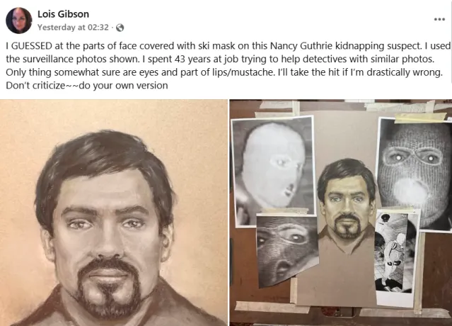 “Vi partes do rosto da sequestradora de Nancy Guthrie cobertas por uma máscara de esqui. Usei as fotos de vigilância que mostrei”, disse Lois Gibson, que se aposentou do Departamento de Polícia de Houston em 2021 e está listada no Livro Guinness de Recordes Mundiais como a artista forense de maior sucesso do mundo. escreveu Esboço, bem como Facebook.