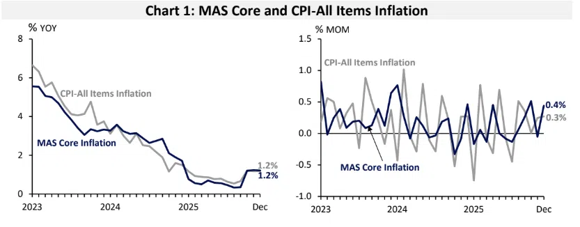 Entretanto, a Autoridade Monetária de Singapura (MAS) e o Ministério do Comércio e Indústria (MTI) afirmaram num relatório conjunto de 23 de Janeiro que a inflação global foi em média de 0,9%, abaixo dos 2,4% do ano anterior.