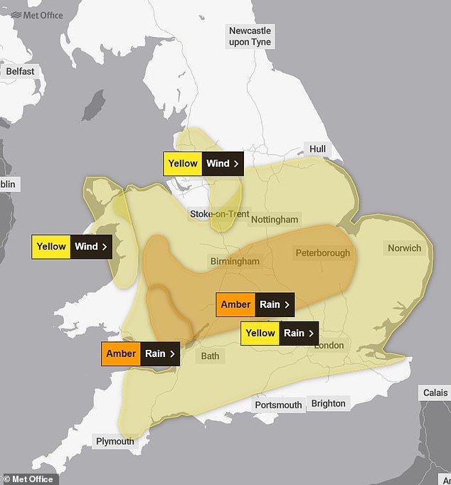 Um alerta amarelo generalizado e prolongado de chuva também foi emitido para a maior parte do sul da Inglaterra e Midlands, que permanecerá ativo das 6h de amanhã até as 6h de sábado.