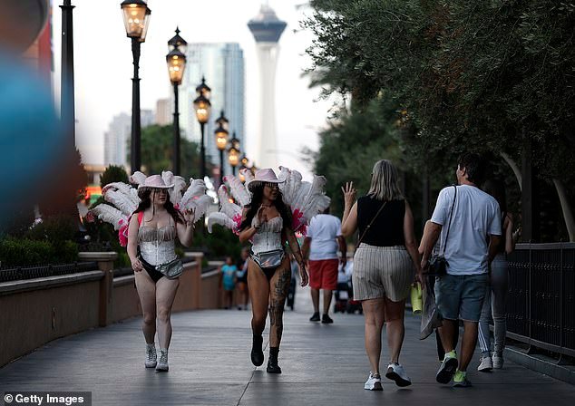 Las Vegas recebeu 4,56 milhões de visitantes em agosto, uma queda de 6% em relação ao mesmo período do ano passado. Mulheres vestidas como dançarinas acenam para visitantes andando na Las Vegas Strip