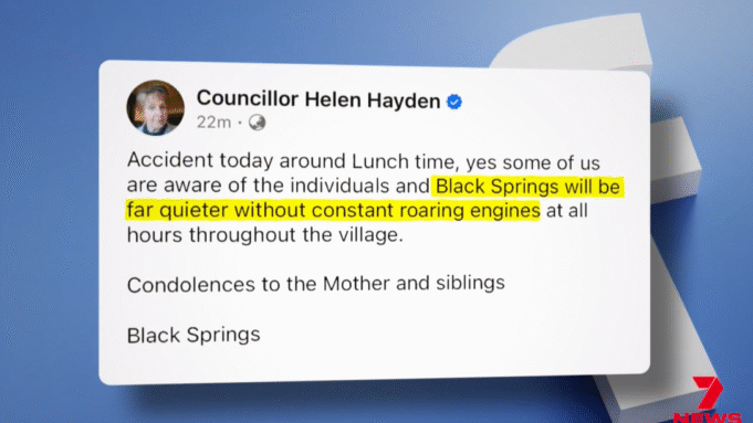 Horas depois da notícia do acidente, a vereadora de Oberon, Helen Hayden, afirmou em uma postagem agora excluída no Facebook: “Black Springs ficará mais silencioso sem motores barulhentos”.