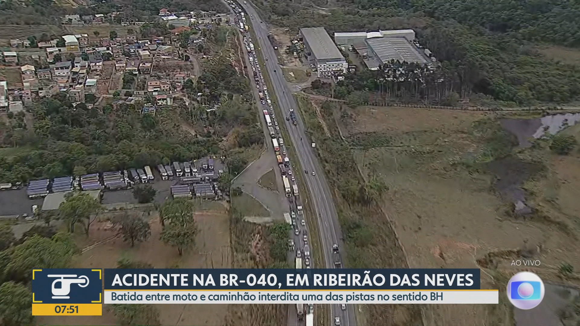 O engarrafamento da rodovia se estende por mais de 6 km no sentido Belo Harijanta. BR-040 Acidente envolvendo duas carretas e uma motocicleta. Pelo menos uma pessoa morreu em uma colisão entre uma motocicleta e duas carretas na BR-040, próximo ao bairro Vereda, em Ribeirão das Neves, na região metropolitana do Globocop Belo Horizonte. Informações iniciais indicavam que o homem que estava atrás da motocicleta morreu, enquanto o motorista tentava manobrar entre os dois caminhões. Houve engarrafamento no km 514 sentido Belo Harijanta. Apenas a faixa da esquerda estava liberada aos motoristas por volta das 7h30. Filas de veículos cruzaram a rodovia na altura do bairro Veneza, ultrapassando os 6 km de extensão. Este relatório está sendo atualizado porque a extensão do engarrafamento ultrapassou 6 km. Vídeo mais visto do Globocop do G1 MG