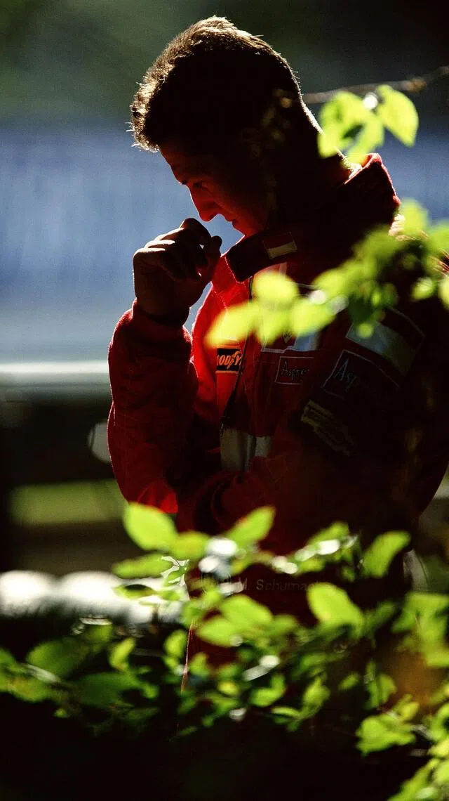 Esse momento íntimo do famoso Schumacher privado foi o resultado de um jogo de gato e rato entre o fotógrafo de automobilismo Darren Heath e o motorista da Ferrari por 45 minutos no Grande Prêmio alemão de 1998.