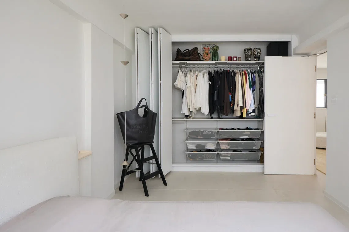 Atrás de um conjunto de portas sanfonadas fica o guarda-roupa do proprietário.