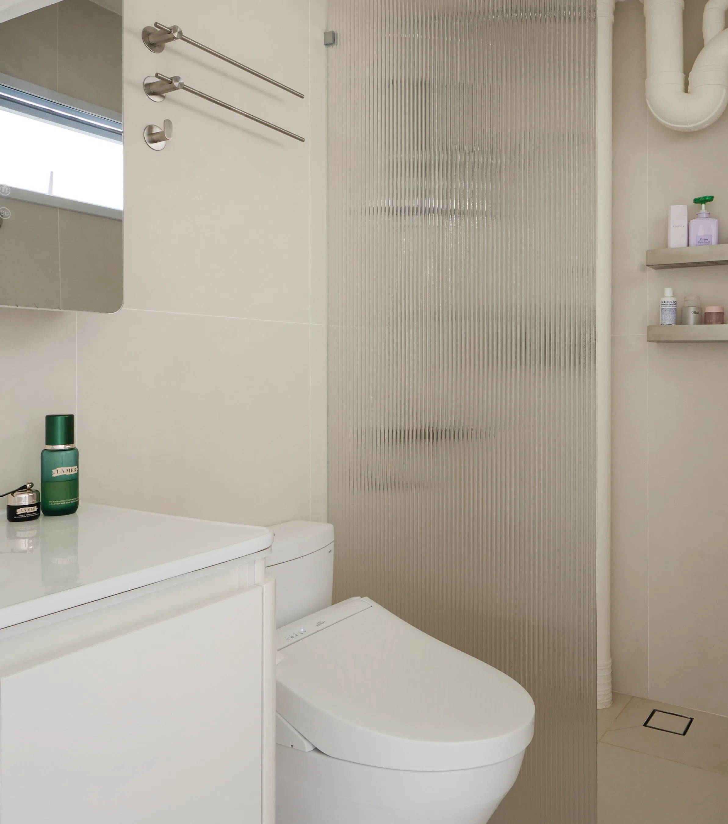 Neo escolheu painéis de vidro canelado de fácil manutenção para o banheiro principal. “Com o vidro transparente, é preciso limpar sempre a água e a condensação, o que é mais prático. Pedimos ao robô que fizesse todas as outras limpezas.”