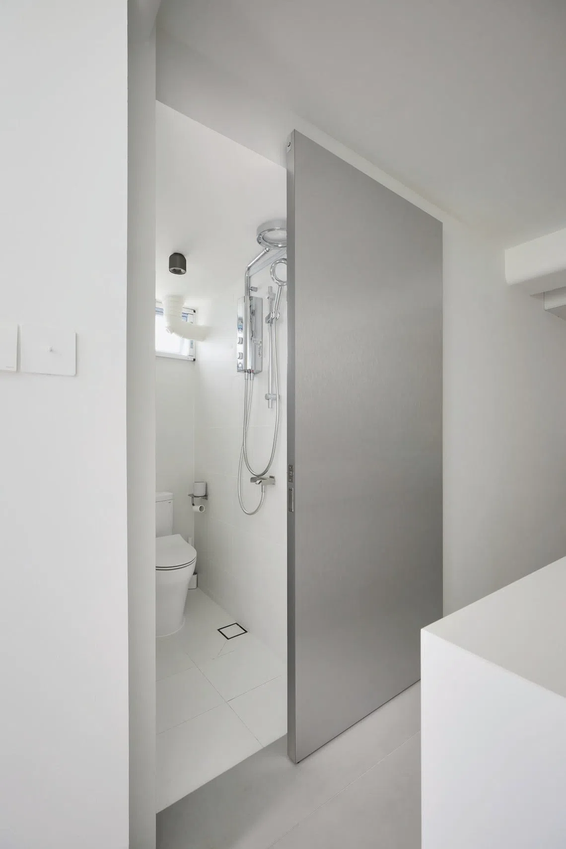 ela Escolhemos uma paleta prateada e branca para criar a ilusão de um espaço maior com acabamentos e enfeites cromados. Por exemplo, a porta do banheiro compartilhado é laminada cromada. As paredes são pintadas na tonalidade Sail White pela Nippon Paint Odores.