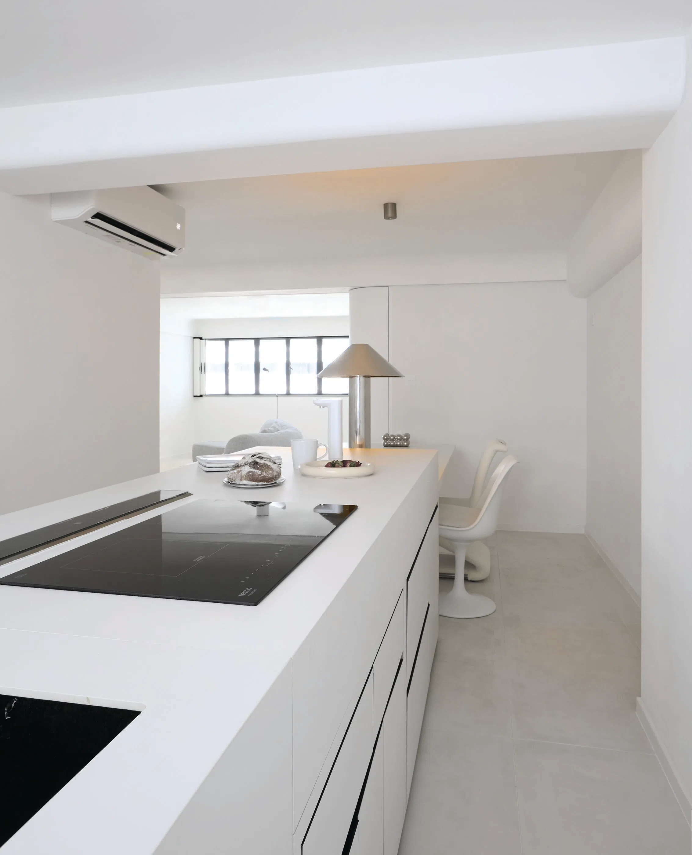 “Os tetos do HDB são bem baixos. Eu não queria colocar nada no teto, então construí uma ilha embutida”, diz ela. “Basta apertar o botão e o fogão liga.”