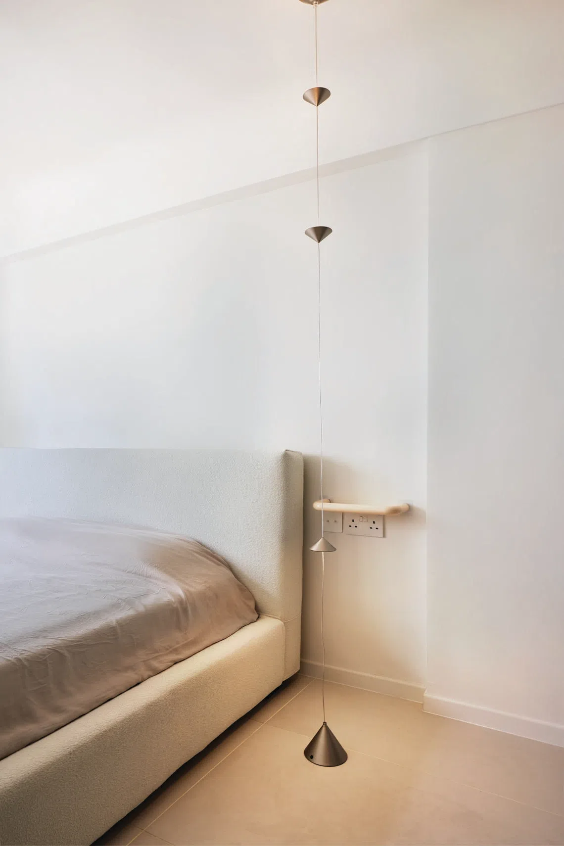 O quarto principal está arrumado e sem móveis desnecessários. A cama queen-size e a base são feitas de Taobao e cobertas com lençóis de seda. Em ambos os lados da cama há luminárias pendentes do chão ao teto que lembram chapéus de sol cônicos.