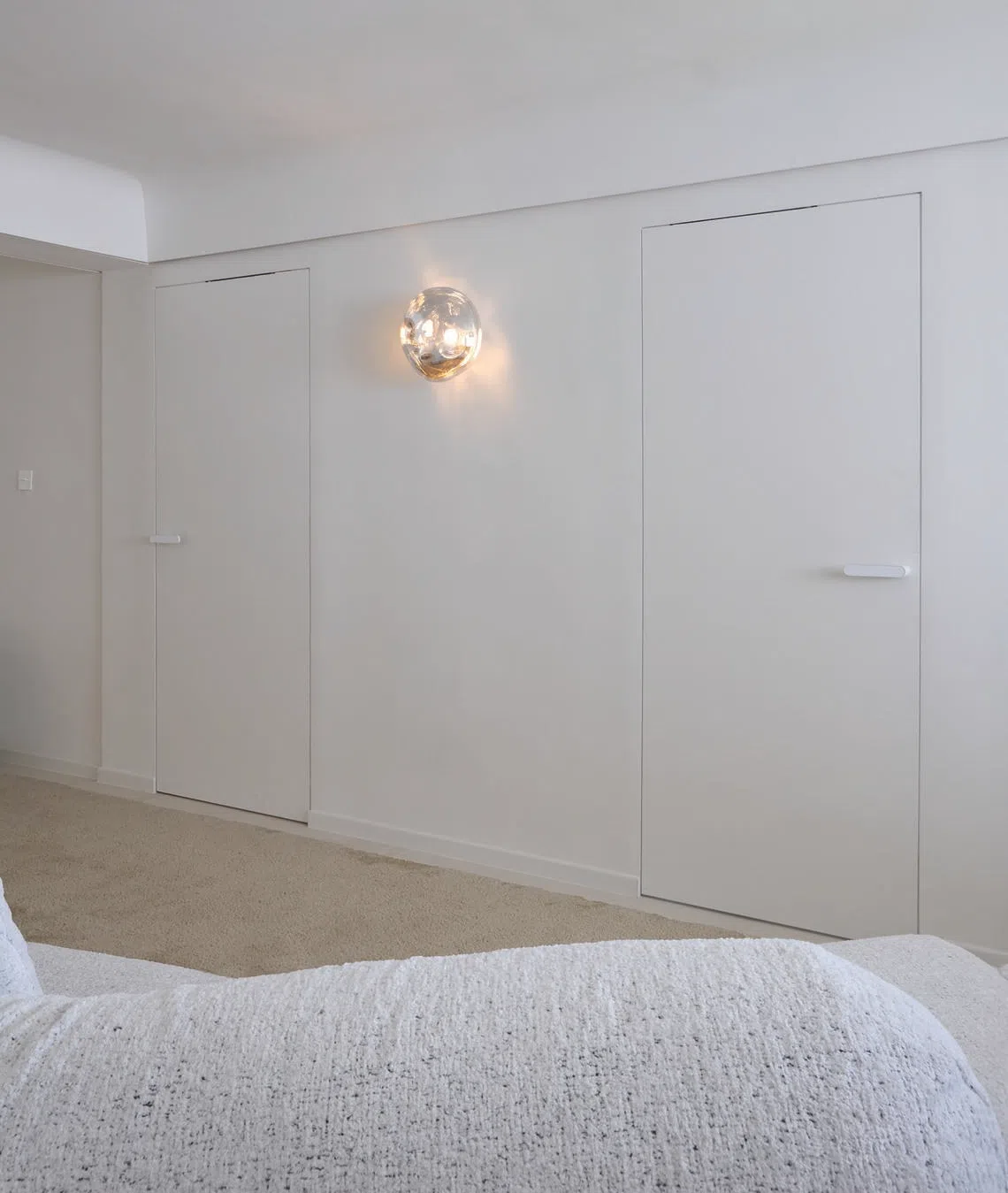 Arandelas cromadas preenchem o espaço entre as portas do quarto.