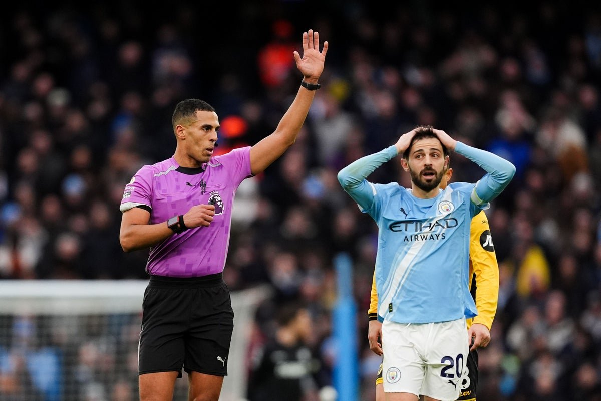O árbitro Farai Hallam, que comandava seu primeiro jogo na Premier League, anulou a cobrança de pênalti para dar ao City o placar de 1 a 0 depois que Omar Marmouse jogou a bola no braço de Yerson Mosquera.