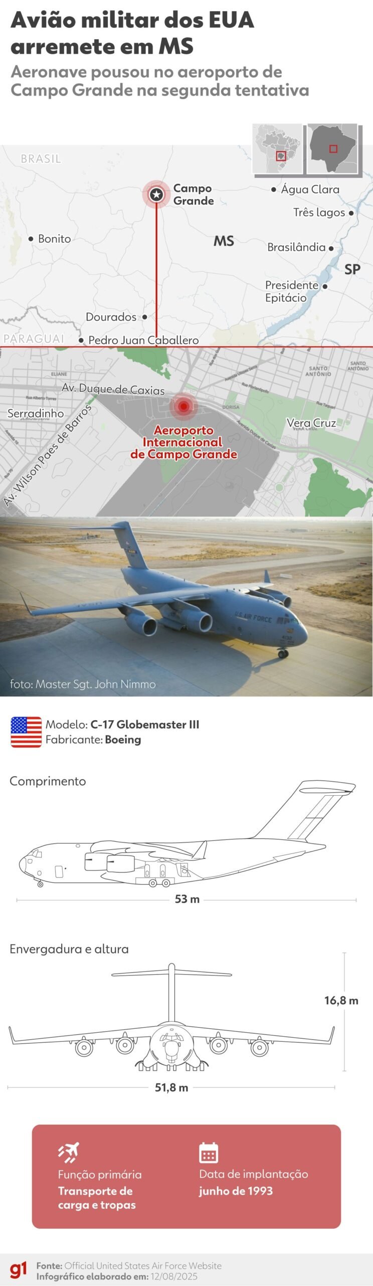 O avião da Guerra dos EUA fica em Campo Grand, três aeronaves militares em C -17 Gloomaster III (USAF), rola no ar no ar para treinamento e integração de guerra com as forças brasileiras em Campo Grand (MS). Woz Elias Zahran tentou pousar no aeroporto internacional enquanto uma das aeronaves se afastava; Clever foi gravado no vídeo (veja acima). Este modelo aplicado à USAF no 5º é capaz de transportar o IELD para até 69 toneladas e mais de 100 paraquedistas. O modelo desta aeronave também foi usado para trazer cidadãos exilados dos Estados Unidos. O objetivo do que é fortalecer a cooperação entre Fabs, Exército, Marinha e Forças Estrangeiras. No domingo (1), ele conseguiu pousar o último avião que foi quebrado na segunda tentativa. Não há informações sobre o que a multidão inspirou. C -17 Globemaster III: Aeronaves militares dos EUA. Tente pousar no Campo Grand Art G1 produzido pela Boeing, o C -17 Globalmaster III pode viajar até 53 metros de comprimento, 16,79 metros de altura e até 265 toneladas. O design da aeronave permite que os shorts entrem em locais curtos e ricos em richos. C -17 é considerado uma das aeronaves versáteis de carga da Força Aérea dos EUA. Ele transporta pacientes para a missão estratégica, lançamentos aéreos e tratamento. Sua principal tarefa é levar o exército e o equipamento para a região mais próxima do conflito. Atualmente, a Força Aérea dos Estados Unidos opera aeronaves 223C -17. Eles são usados por vários comandos militares, como mobilidade aérea, reservas, guardas nacionais e treinamento. A aeronave estava operando uma missão de treinamento local no norte da Califórnia. EUA Force Louis Brissis USA O avião é extenso das impressões dos EUA para o vídeo de Campo Grand Watch de Mato Groso da Sul Videos