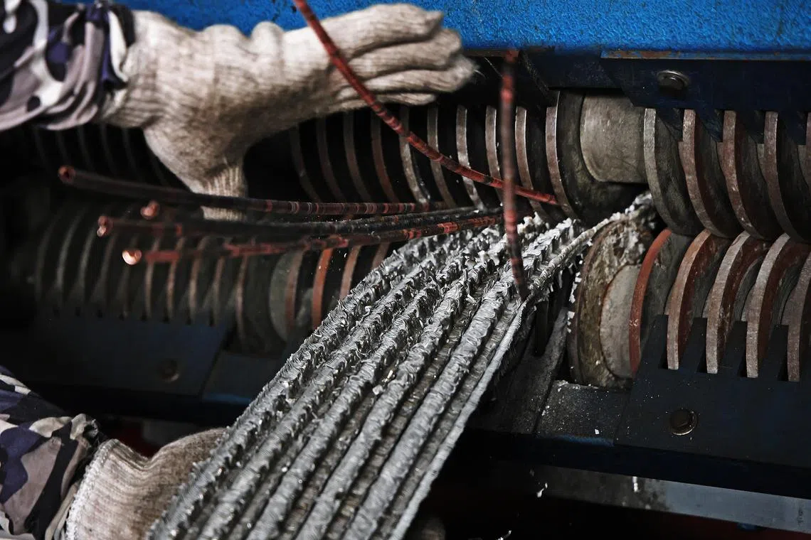O alumínio de um radiador de ar-condicionado é descartado na instalação de reciclagem de ar-condicionado da cidade Gain City.
