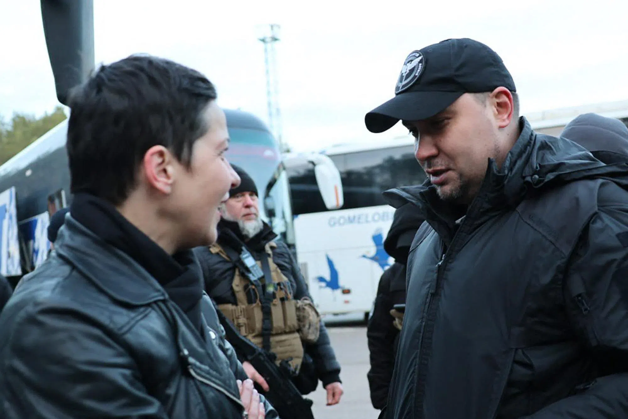 Maria Kaleznikova (à esquerda) fala com o tenente-general Kirillo Budanov, chefe da inteligência militar da Ucrânia, após a sua libertação em 13 de dezembro.